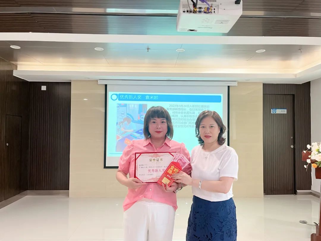 眼健康服务部筛查师袁米娜获得“优秀新人奖”荣誉,我院眼健康服务部高军主任为其颁奖!